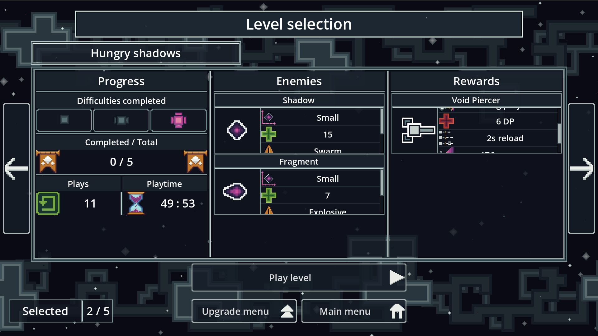- 3 Difficulties (Easy, Normal and Hard), at the moment they only increase the amount of enemies in each wave, some upgrade points given by progress/challenges are awarded per-difficuly to get more points before trying higher levels.