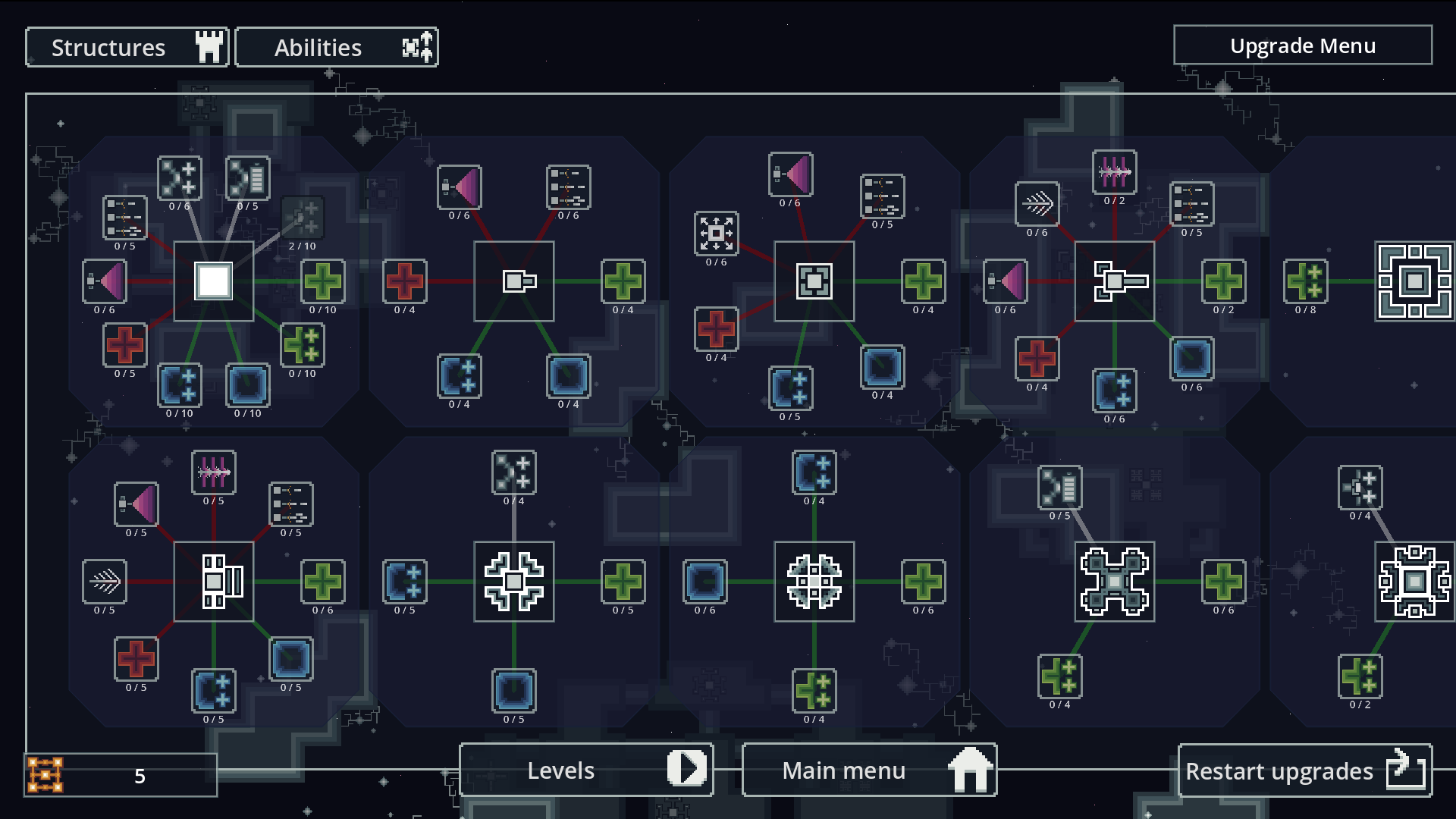 - A0.36.X - Rediseño del menú de mejoras, para soportar contenido futuro este menú necesita ser rediseñado completamente, el nuevo menú separara estructuras y habilidades con sub-categorías para tamaños de estructuras [Especiales, Pequeñas, Medianas, Grandes, Gigantes, Colosales] y habilidades segun modos [Ataque, Defensa, ...].