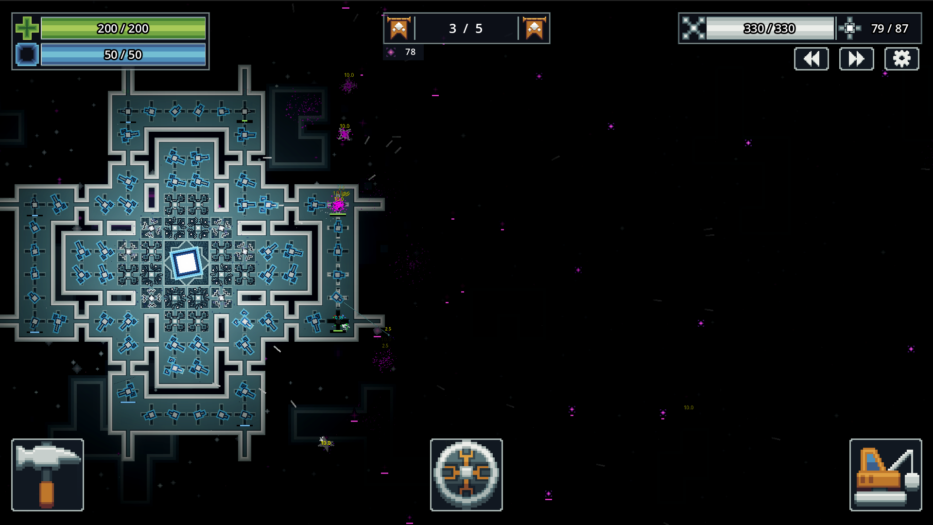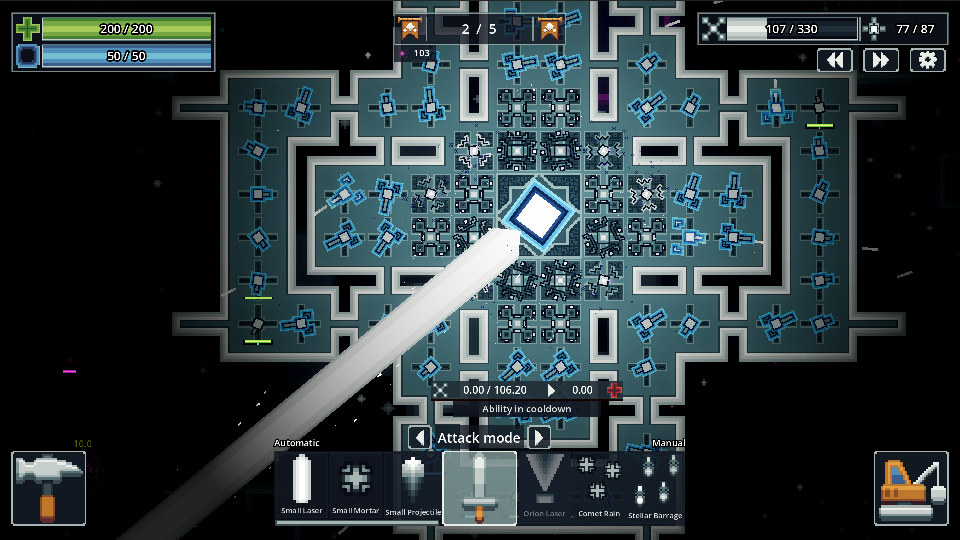 - Habilidades del núcleo, el jugador puede controlar los ataques que usa el núcleo y cargar energía para efectos especiales que pueden apoyar a las torres o destruir enemigos.
